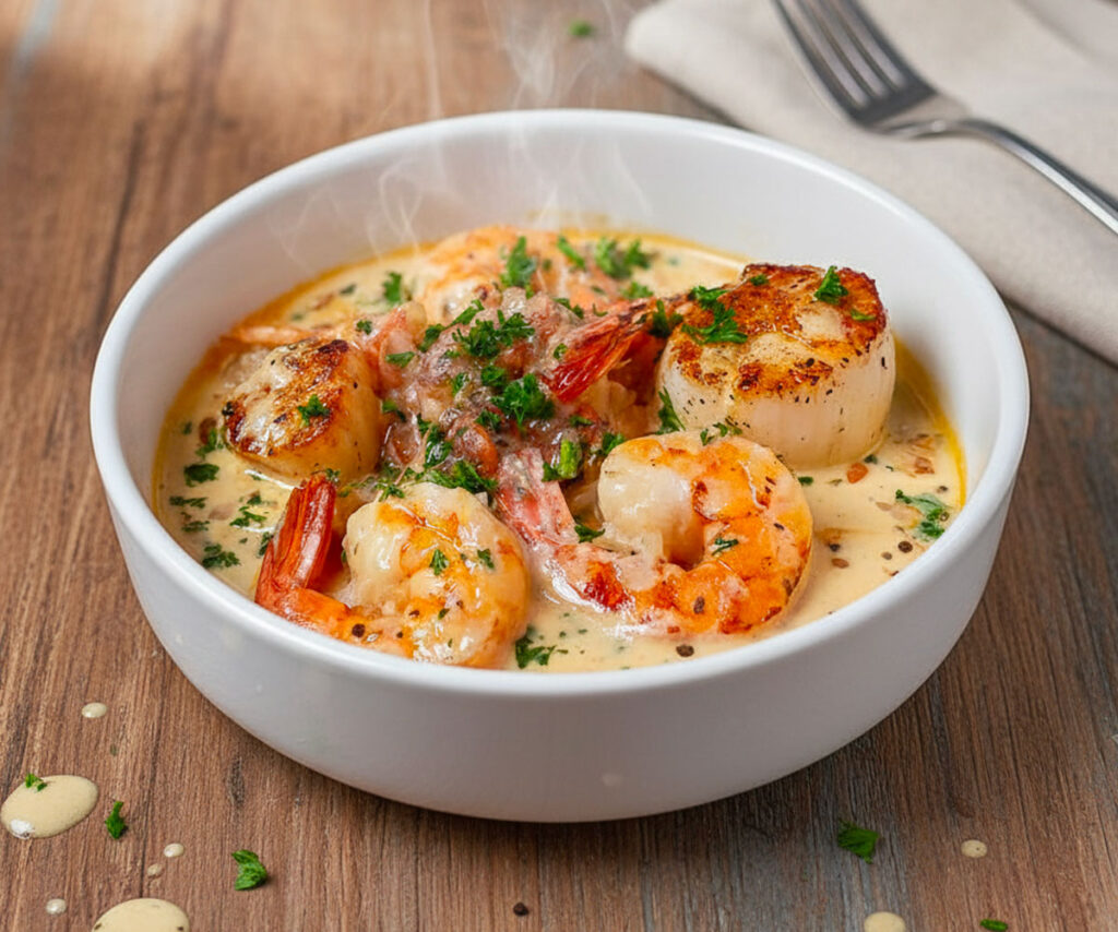 Toto jedlo sa rovnako dobre hodí na vianočný stôl, romantickú večeru alebo dokonca v mini verzii na elegantný koktailový večierok. Tieto morské plody, prezentované v malých jednotlivých zapekacích miskách, vždy urobia krásny dojem a ľahko sa prispôsobia meniacim sa chutiam. S ľahkou prílohou, ako je voňavá ryža alebo nakrájaná zelenina, sa dokonca dajú premeniť na hlavné jedlo.