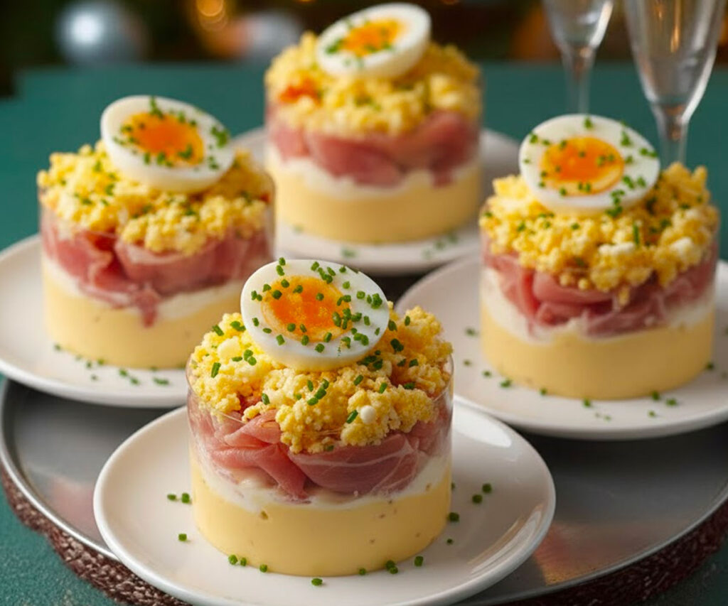 Počas osláv často hľadáme nápady na predjedlá, ktoré sú netradičné a nevyžadujú si hodiny strávené v kuchyni. Tento recept je dokonalým kompromisom: ľahko sa pripravuje a dá sa dokonca pripraviť vopred, čo je skutočnou výhodou pri pohostení. Vrstvené prvky vytvárajú krásny vizuálny efekt, zatiaľ čo klasické chute – vajce, šunka a zemiaky – sú univerzálne príťažlivé.